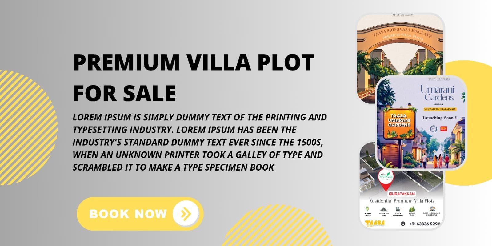 New Home Home Projects About Contact Book Now PREMIUM VILLA PLOT SALE Discover exceptional residential plots in Chennai's most sought-after locations. Build your dream home with The Taasa Group's RERA-approved premium projects. BOOK NOW Launching Soon Umarani Gardens Vandalur-Urapakkam, Chennai Starting from ₹1,52,000 Available Taasa Srinivasa Enclave Guduvanchery, Chennai Starting from ₹1,78,000 Why Trust Taasa Group? Building foundations of trust through transparency, quality, and unwavering commitment to our customers. Verified Properties Every plot we offer is legally vetted and verified, ensuring a safe and secure investment. Transparent Process No hidden fees or surprises — just honest guidance from start to finish. Personalized Support We listen to your needs and help you find a plot that matches your vision and budget. Featured Projects Explore our premium villa plot developments across Chennai Launching Soon Umarani Gardens Vandalur-Urapakkam, Chennai Premium villa plots with modern amenities in a serene environment Starting from $152,000 View Details Available Taasa Srinivasa Enclave Guduvanchery, Chennai Exclusive residential plots with world-class infrastructure Starting from $178,000 View Details View All Projects Elegance Captured - Our Project Gallery Browse through our collection of completed and ongoing projects that showcase our commitment to excellence. Our Videos Take virtual tours and hear from our happy customers. Umarani Gardens Walkthrough Customer Testimonials Construction Progress Update Ready to invest in your dream plot? Get in touch with our team to schedule a site visit and explore available options Contact Us Today